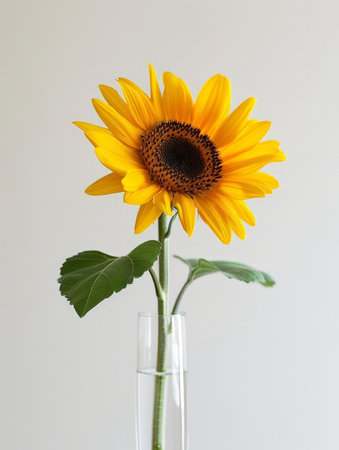 A single, radiant sunflower stands in elegant detail against a soft gray background.