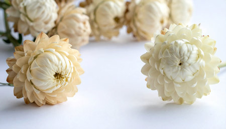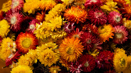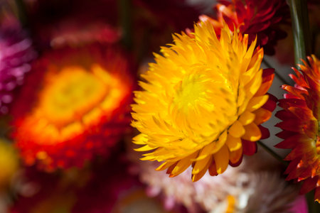 Colorful everlasting daisies arranged in a still life against a neutral background