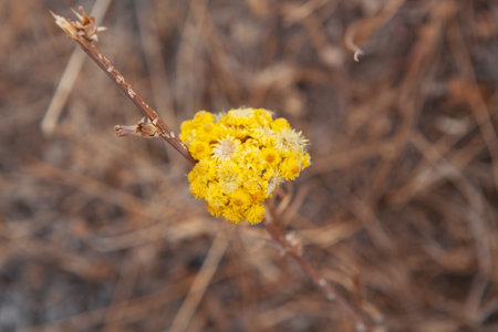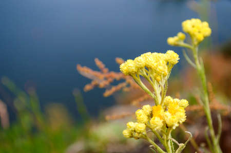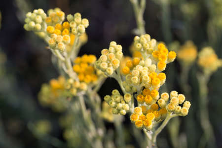 Helichrysum arenarium dwarf everlast immortelle yellow flowers in meadow macro selective focus