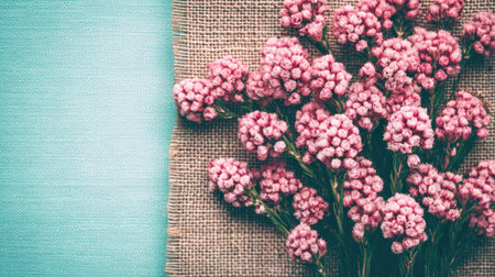 Flat lay arrangement featuring a cluster of tightly packed, small pink dried flowers positioned on the right side, resting against a section of rough, light brown burlap or jute fabric. The left side of the frame is dominated by a contrasting smooth, textured material in a muted teal or turquoise color, providing ample negative space for text or design elements.
