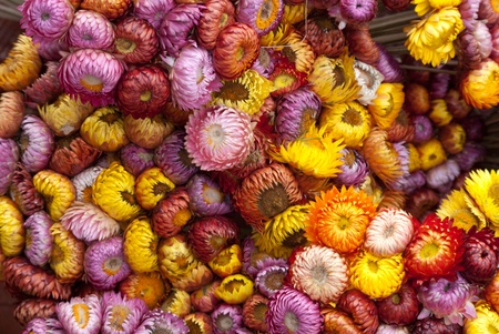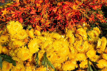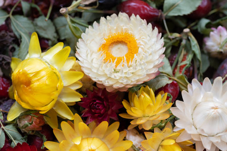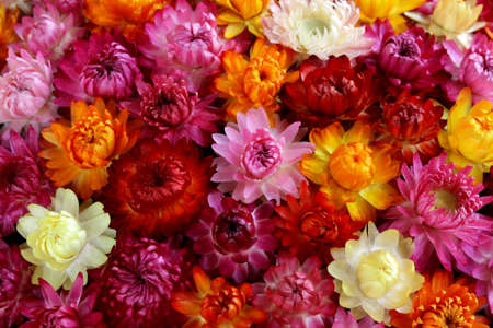 Beautiful composition of dry red, yellow and orange immortelles on white background. Other names of the flowers are Helichrysum, Xerochrysum, Xeranthemum. Natural background.