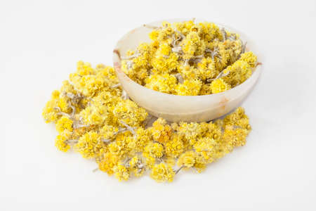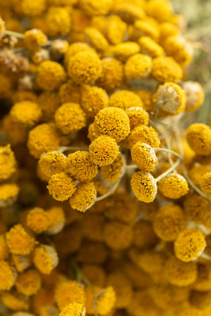 Immortelle yellow flowers closeup. Helichrysum arenarium or dwarf everlast flower.