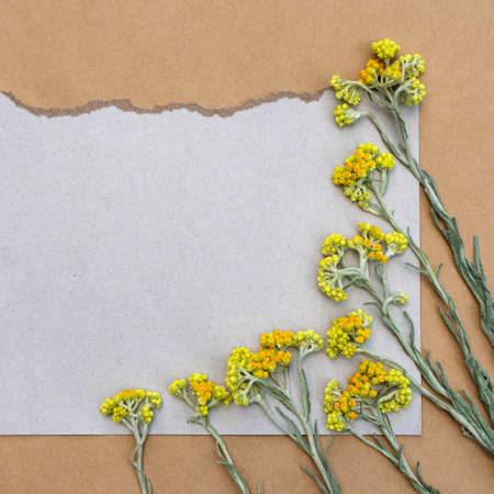 Delicate card with wild dry yellow flowers on gray paper with copy space for design.