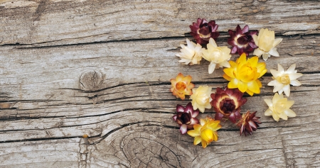 Grouping colorful strawflowers, also known as Helichrysum, and green leaves on a light wooden background