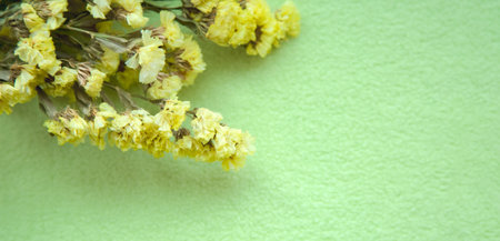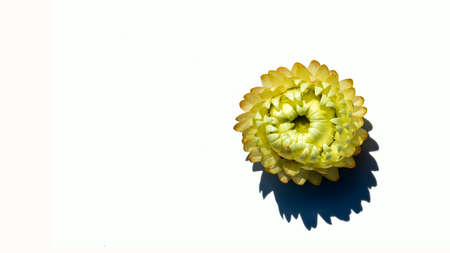 Helichrysum yellow everlasting flowers on yellow background top view copy space. Congratulations for March 8, Mothers Day, Valentines Day, Easter or spring concept.