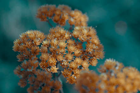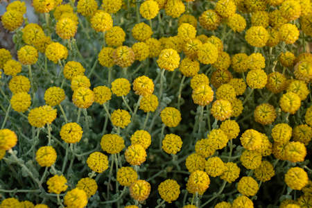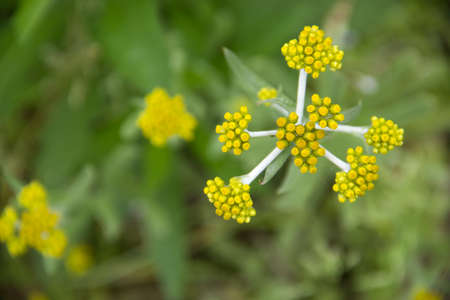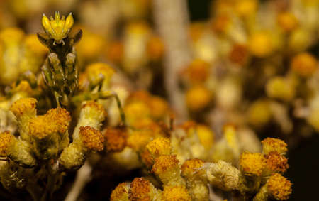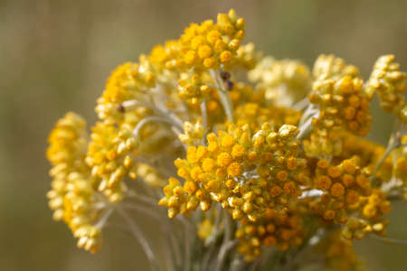 Helichrysum stoechas Common shrubby everlasting flower of god shrub plant with yellow flower corsages with waxy-looking calyx on unfocused greenish brown background light by flash