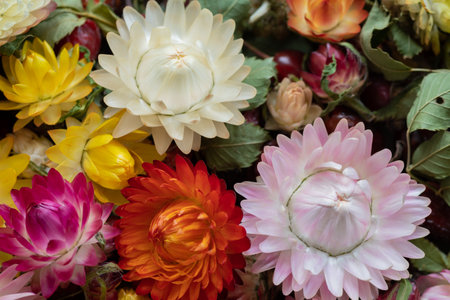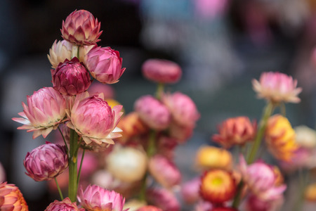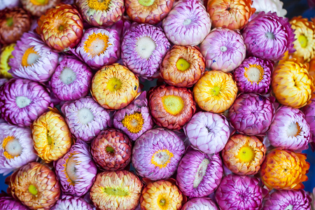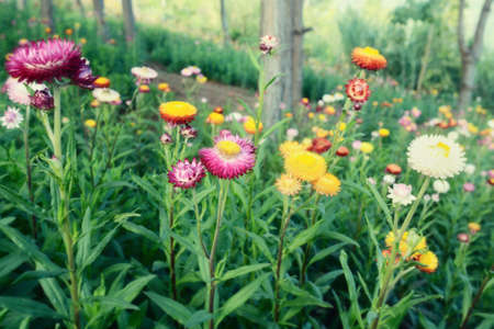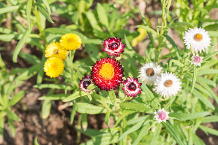 Straw flower of colourful beautiful on green grass nature in a spring garden.