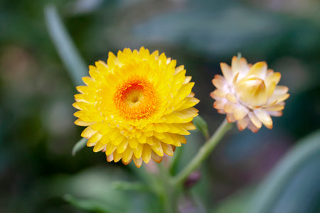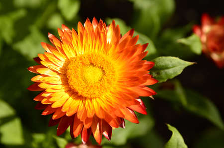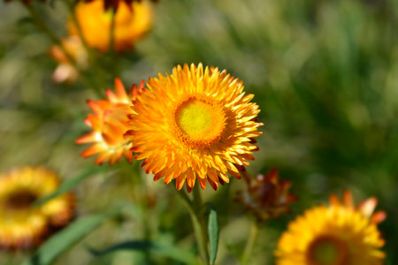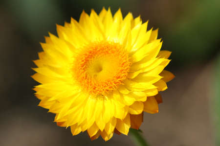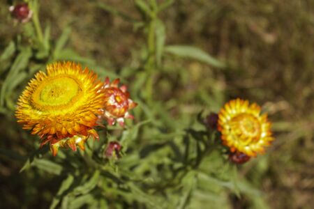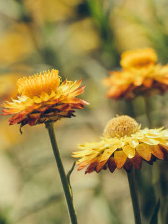 Beautiful straw flower (everlasting) close-up on blurred background, Helichrysum bracteatum (Venten.) Willd.