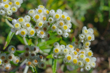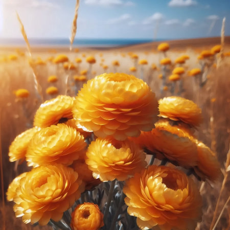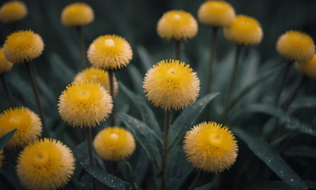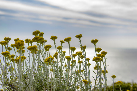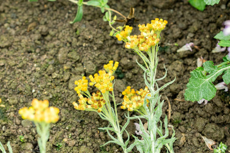 Helichrysum arenarium flowers in bloom, selective focus, shallow DOF.