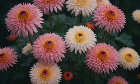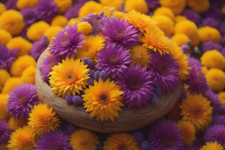Colorful autumn flowers in a wooden bowl. Selective focus. generative ai