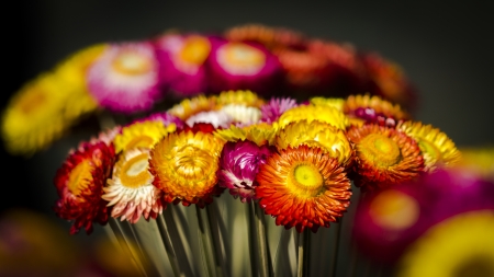 Colorful strawflowers form a vibrant everlasting bouquet in a glass vase