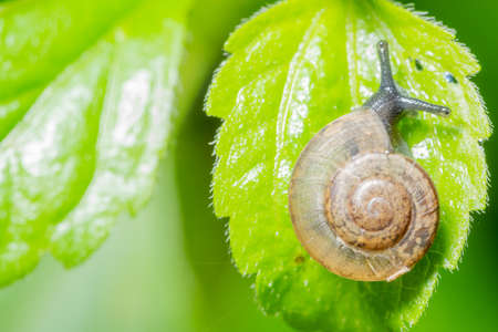 Snail crawling on green leaf after rain