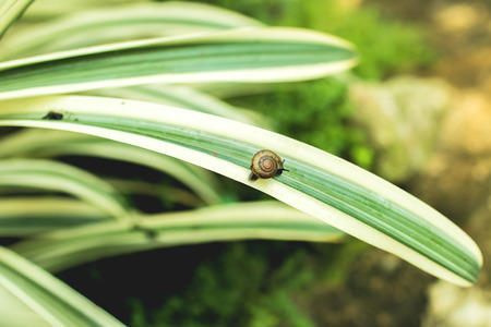 Beautiful brown snail on green leaves