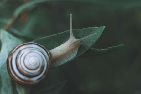 Closeup of a small snail in a shell on a green leaf, horizontal