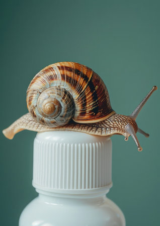 Concept of Snail Mucin or Snail Secretion Filtrate. A snail crawling on a white bottle with a dispenser, close-up bottle mockup