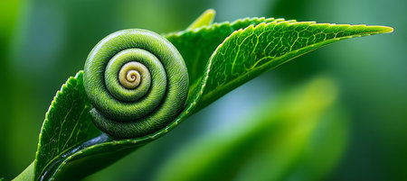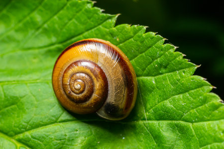 A charming snail glides gracefully on a vibrant green leaf, showcasing its beautifully patterned shell in a tranquil natural setting.