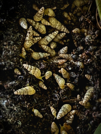 Closeup of a Snail shell in the dirt ,Foliage, Selective Focus, moody theme.