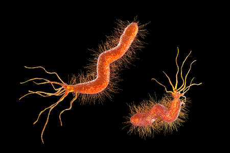 Helicobacter pylori, bacterium colonizing stomach and associated with gastric and duodenal ulcer, 3D illustration