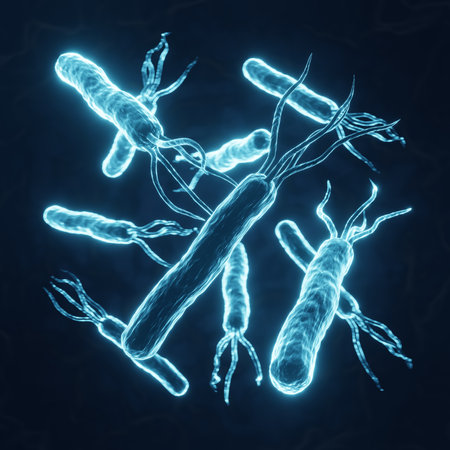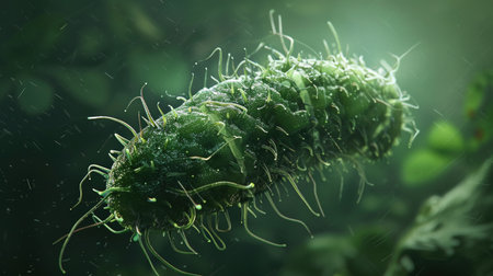 Microscopic view of bacteria with hair-like structures in a dynamic environment
