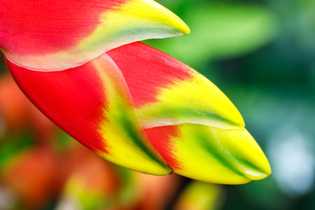 Bright red and yellow Heliconia Golden Torch flowers or Heliconia psittacorum or parrot's flower. Blurred natural background, selective focus.