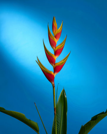 A striking Heliconia flower, also known as a lobster claw, displays its bright red and yellow bracts. The tropical bloom is set against a gradient blue background, highlighting its unique shape and vibrant colors.