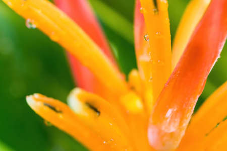 Macro closeup of Yellow orange flower Heliconia psittacorum ,Lobster-claws tropical plants with drop of water nature background.