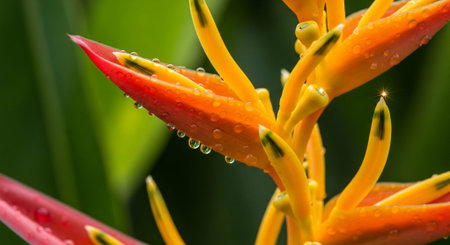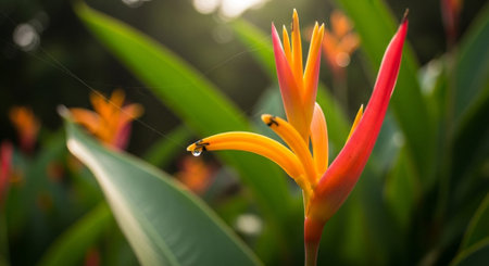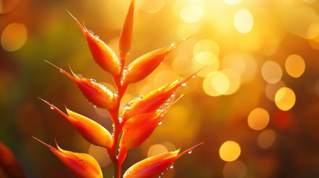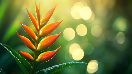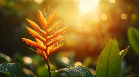 Orange heliconia flower standing tall with subtle water droplets shimmering under a warm light, exotic jungle theme generative ai