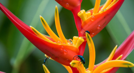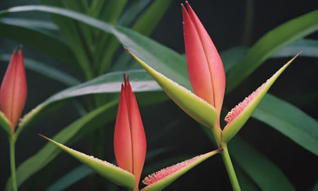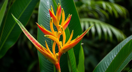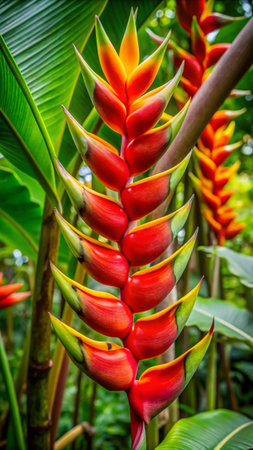 Exotic tropical flowers, vibrant red and orange heliconias surrounded by lush green foliage generative ai