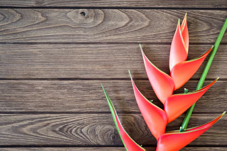 Lay a smooth pattern of Heliconia flowers and leaves on old wooden boards.