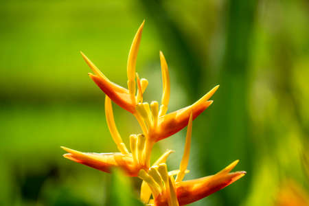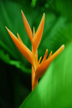 Orange heliconia flower in the garden park for decoration landscape garden area with green leaves in the background.