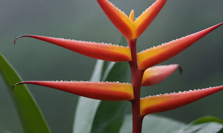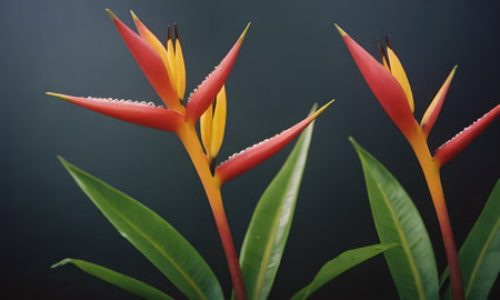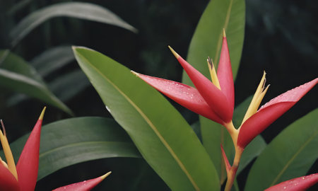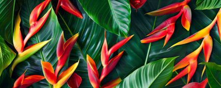 Tropical background featuring bright red and yellow heliconia flowers and green leaves: Bold and vibrant, perfect for a tropical garden