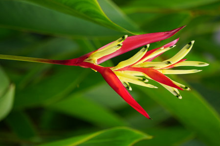 Heliconia rostrata flower, or Hanging lobster claw, close view in tropical garden, image for background