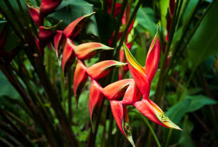 Photo of a macro of bright exotic red flowers in a tropical forest