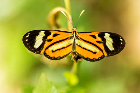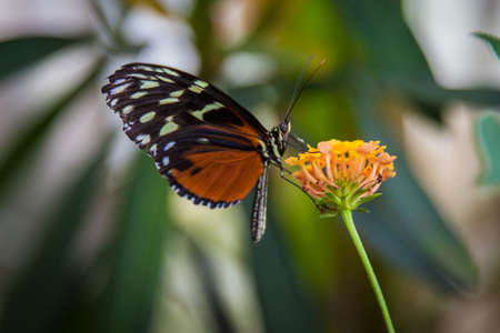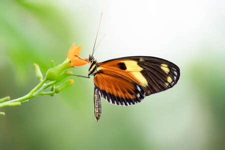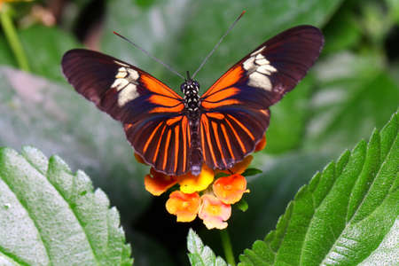 Beautiful Tiger longwing (Heliconius hecale) on an orange flower in the amazon rainforest in South America. Presious Tropical Butterfly. Blurry green background.