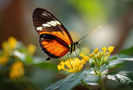 A colorful butterfly with bold orange and yellow hues accented by black patterns, perched delicately on lush green foliage amidst nature's serenity.