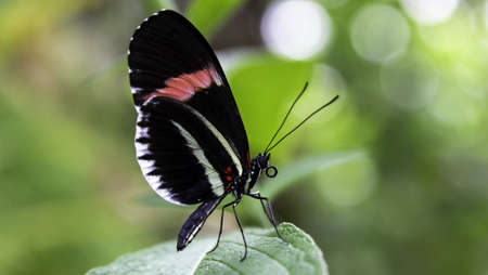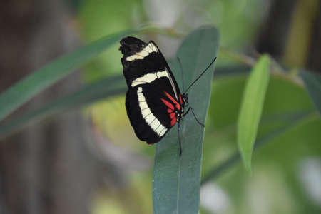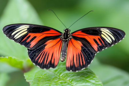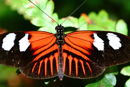 Tropical Postman butterfly with open red, black and white wings resting on a bright green leaf
