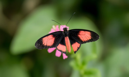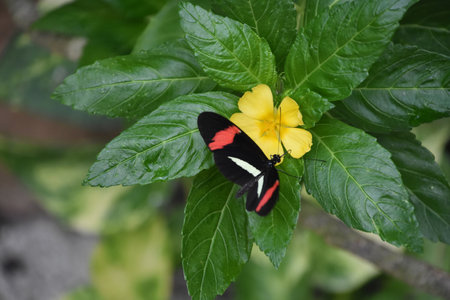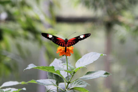 Black and red tropical postman butterfly ( Heliconius Melpomene ) sitting on a flower in a botanical garden