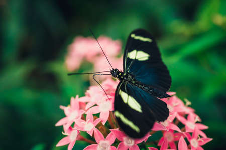 Beautiful butterfly (Heliconius melpomene) perched on a flower and its extended proboscis sipping nectar.