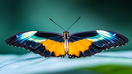 AI-generated A stunning butterfly with orange, blue, and black wings rests on a textured leaf. The shallow depth of field highlights the insects vivid colors.