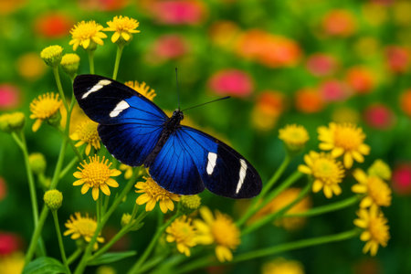 AI-Generated image of a vibrant blue butterfly with striking black wings and white patches resting delicately on a cluster of yellow wildflowers. The butterfly’s iridescent wings shimmer against the bright green stems and petals, creating a bold contrast that highlights its elegance.
