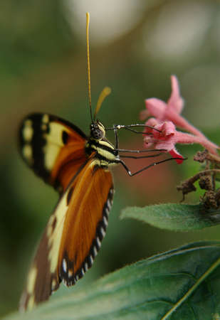 Close up macro or tiger longwing butterfly (Heliconius hecale) on flower