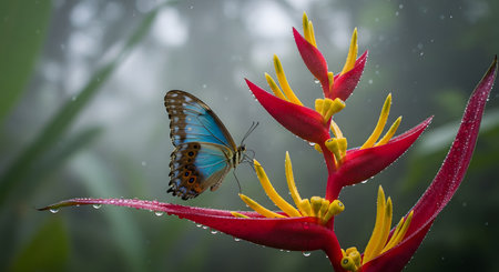 A stunning Blue Morpho butterfly perches delicately on a vibrant red tropical flower covered in raindrops. The misty, green background enhances the exotic and serene rainforest atmosphere.