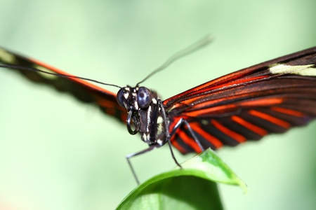 Red postman butterfly, Heliconius erato, on a leaf.