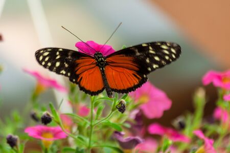 Red postman butterfly (Heliconus erato) on flowers, in garden park Italy