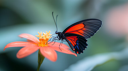 Closeup of a beautiful tropical butterfly on a red flower
