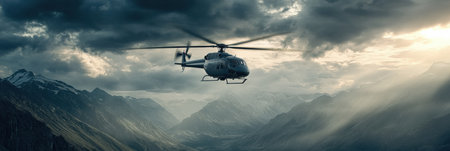 Rescue helicopter maneuvers over rugged mountains as dramatic clouds gather and sunlight breaks through, illuminating the challenging terrain below.