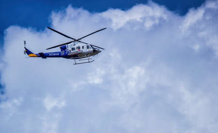 Ronda, Spain - September 06, 2015: A spanish FAASA Bell 412 EC-MAR flying over Ronda against cloudy sky
