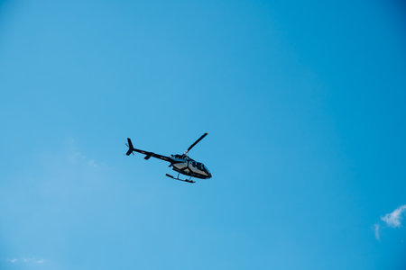 A flying black helicopter aircraft during the flight with blue sky in the background