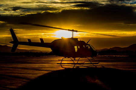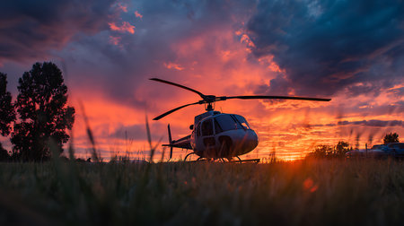 A detailed photograph showcases a helicopter gracefully sitting in a field, back-lit against a fiery and vibrant sunset sky with clouds. Silhouetted trees add depth.