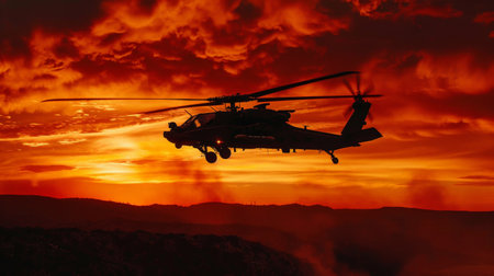 A commanding view of an Apache helicopter hovering over a rugged terrain, its silhouette sharply outlined against the fiery hues of the sunset, weapons bristling and ready for deployment.